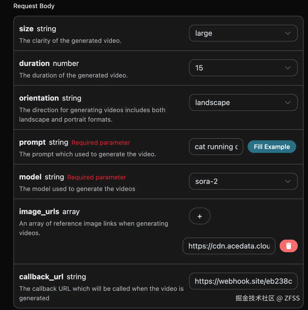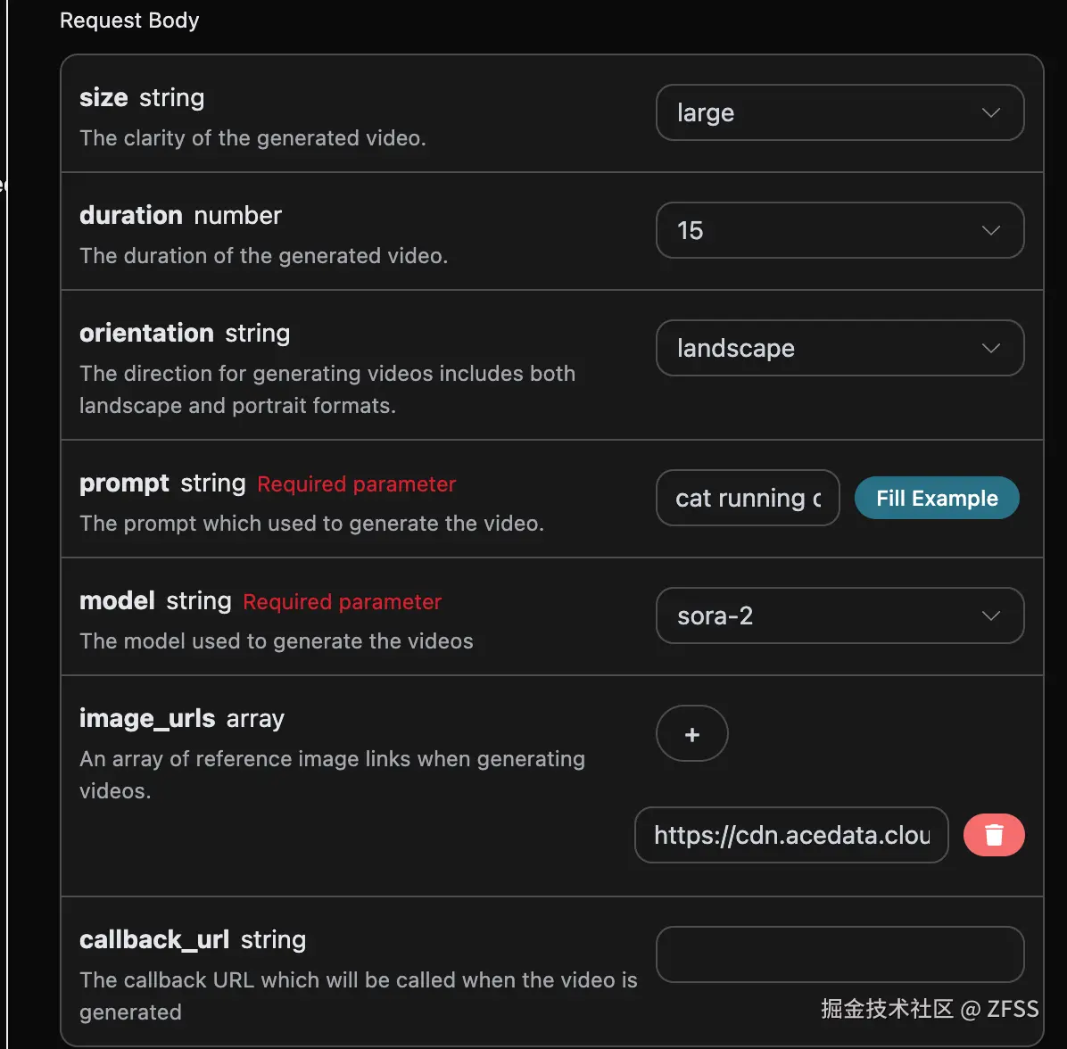 model:生成视频的模型,主要有sora-2、sora-2-pro,目前sora-2、sora-2-pro可以自主选择size、duration参数的视频,其中sora-2-pro可以支持duration为25s的视频,而sora-2只支持10、15秒的视频。size:此次视频生成任务的清晰度,分别有small、large。image_urls:需要上传的参考图片链接或者Base64编码数组。duration:此次视频生成任务的时长,分别有10s、15s、25s,目前只有sora-2-pro支持25s。character_start/character_end:角色在画面中的起止位置(0-1),用于控制主体位置。orientation:画幅方向,支持landscape、portrait、square。prompt:提示词。callback_url:需要回调结果的URL。