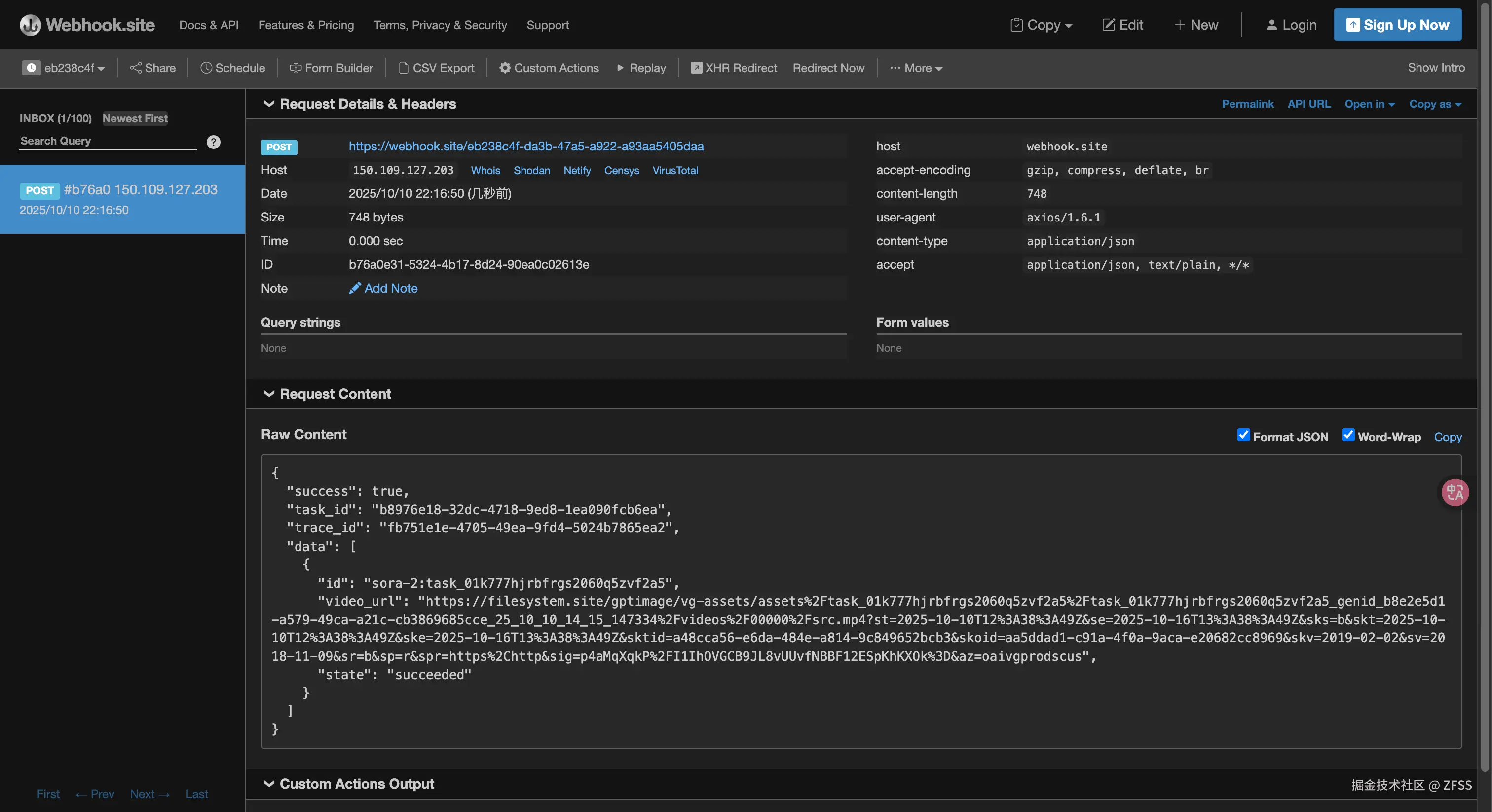 稍等片刻,我们可以在 https://webhook.site/eb238c4f-da3b-47a5-a922-a93aa5405daa 上观察到生成歌曲的结果,如图所示:
