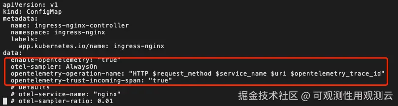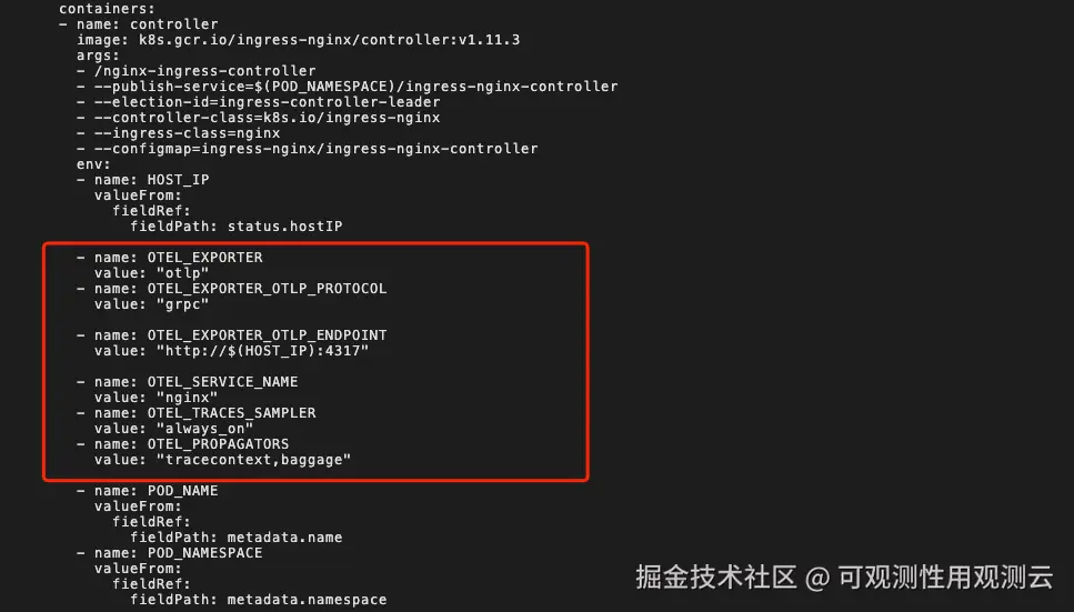 在部署 ingress-controller 配置文件 ingress-nginx.yaml 的 deployment 部分中添加 OTEL 配置,位置在 spec.template.spec.containers.env 下,注意端口开启。