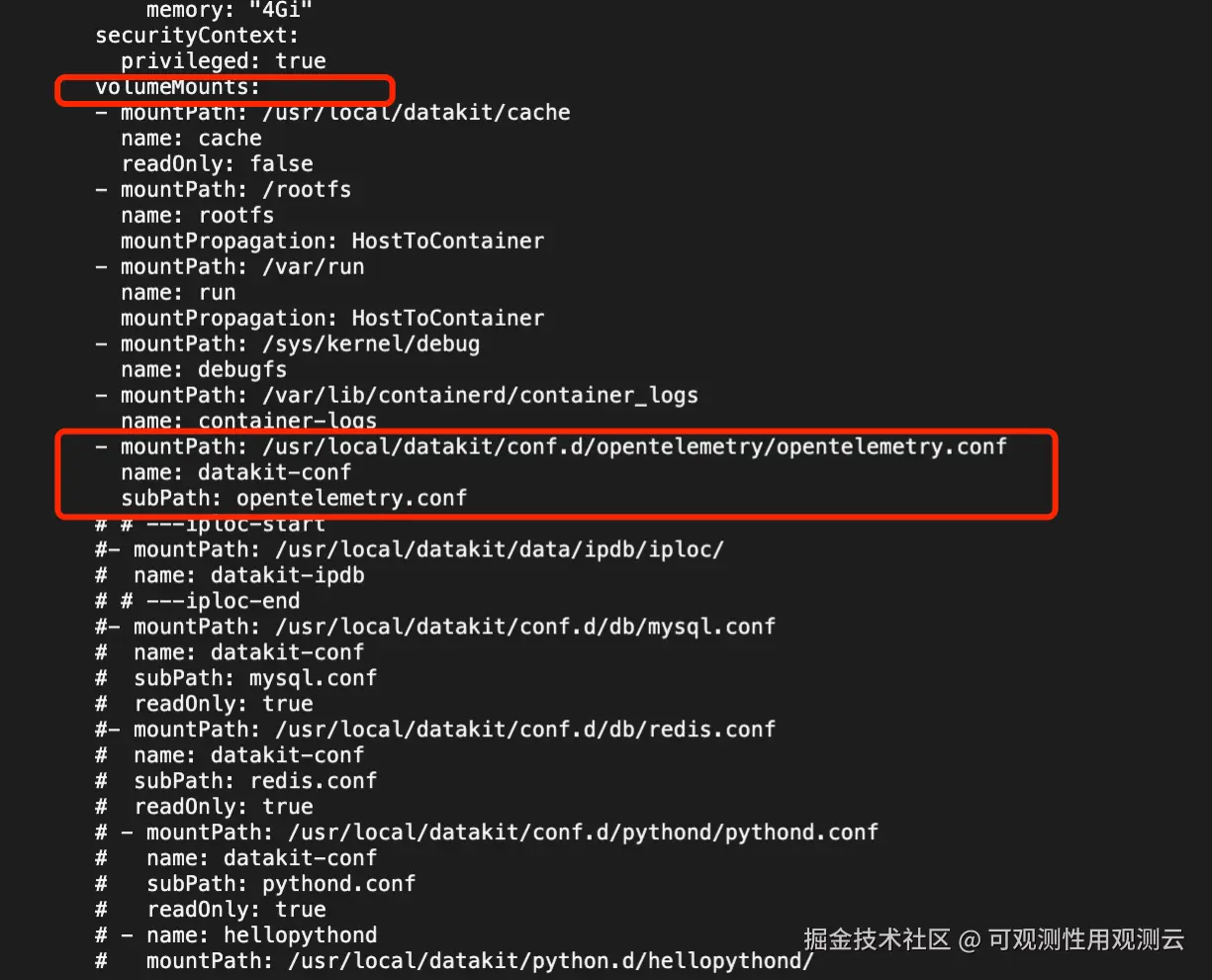 - mountPath: /usr/local/datakit/conf.d/opentelemetry/opentelemetry.conf