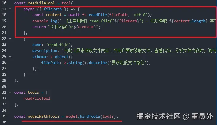 model.bindTools(tools);是将工具数组绑定到 ChatOpenAI 模型实例上,创建一个新的模型实例,这个新实例"知道"有哪些工具可以使用。
