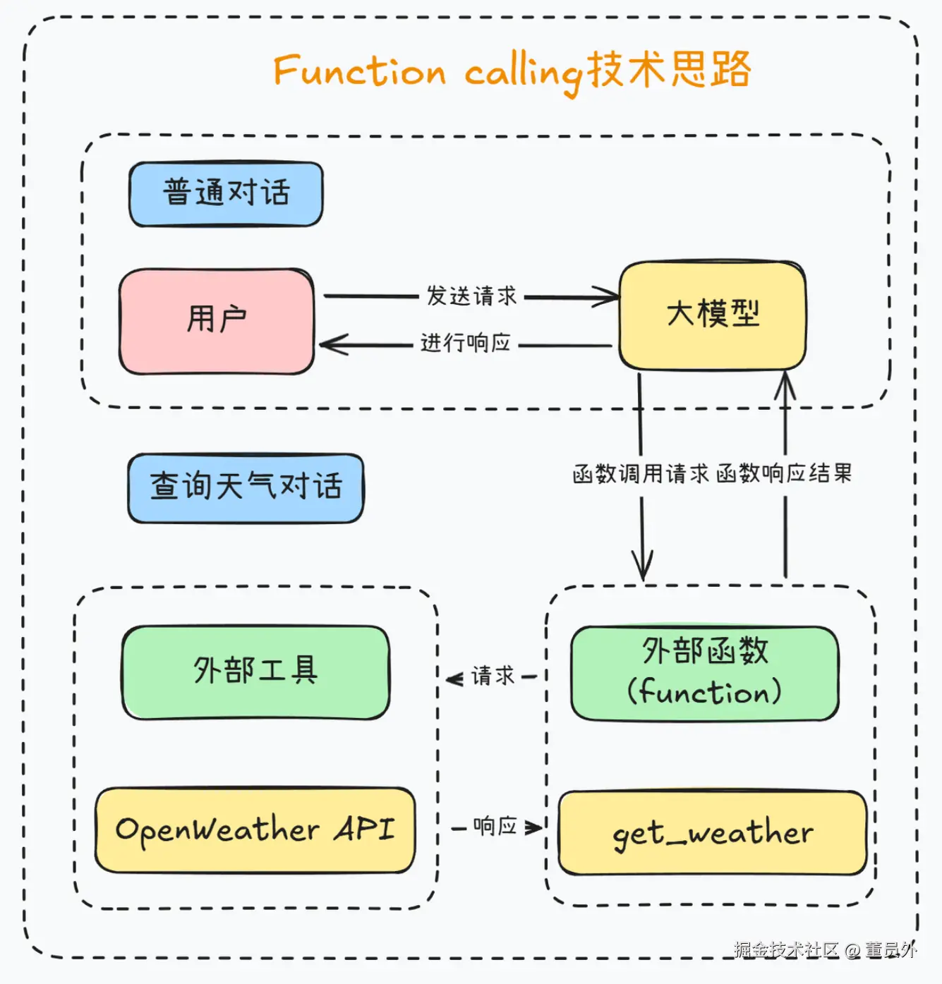 Function Calling 最早是 OpenAI 在其 API 中引入的一项功能,允许开发者将大语言模型(如 GPT-4)与外部函数或工具集成。通过 Function Calling,模型可以理解用户请求并生成调用外部函数所需的参数,从而实现更复杂、更动态的任务处理。