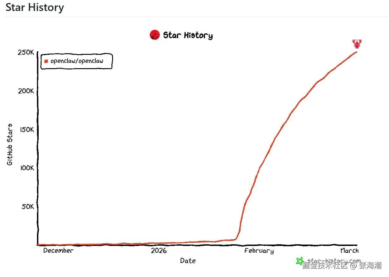 后来我去查了一下,发现这事儿比我想象的离谱——OpenClaw这个项目,在GitHub上短短几个月拿到了20多万颗星星。
