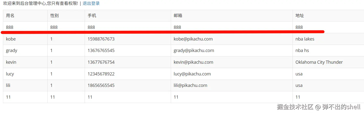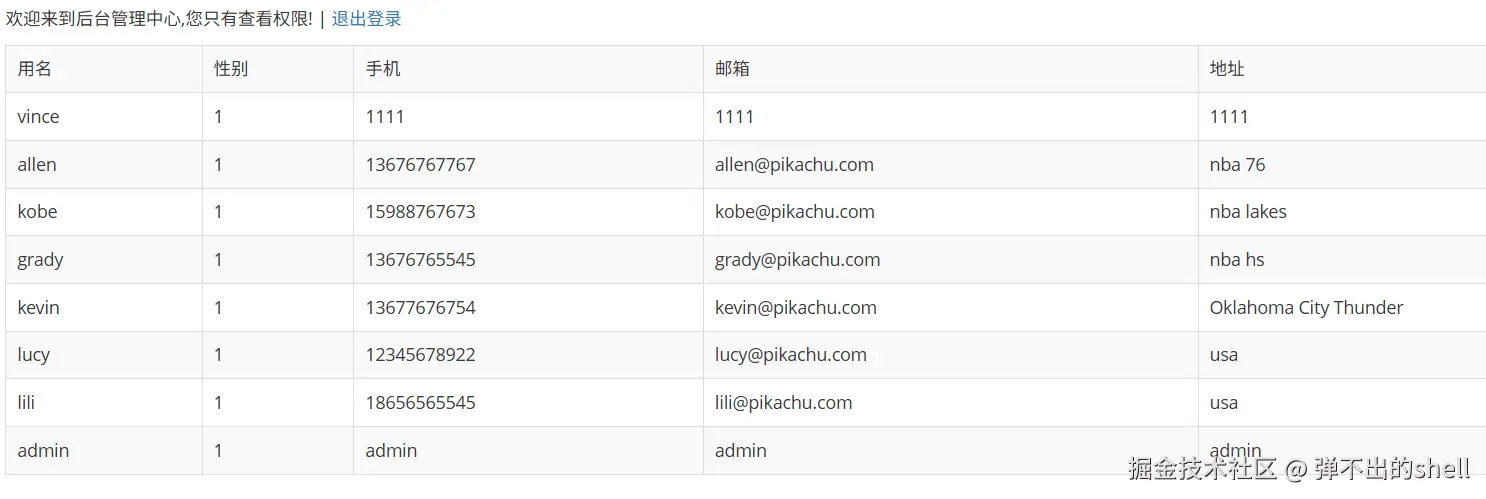 http://pikachu/vul/overpermission/op1/op1_mem.php?username=lucy&submit=点击查看个人信息