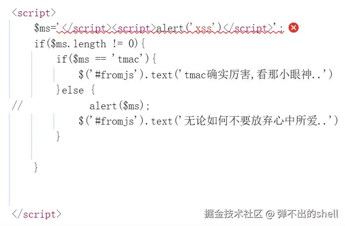 尝试直接插入 <script> 标签,发现 JS 语法被破坏,不能正常执行: