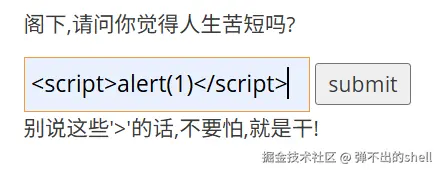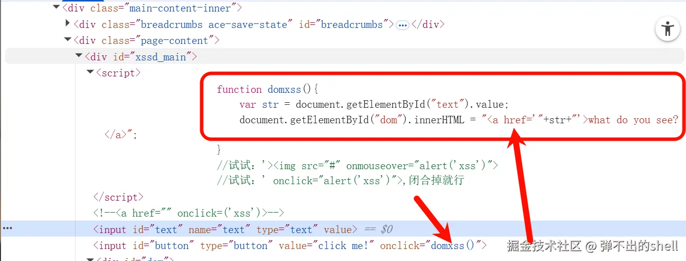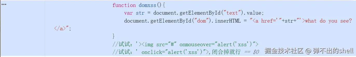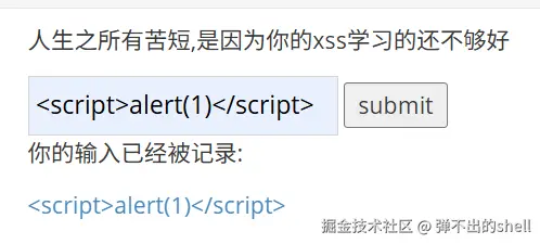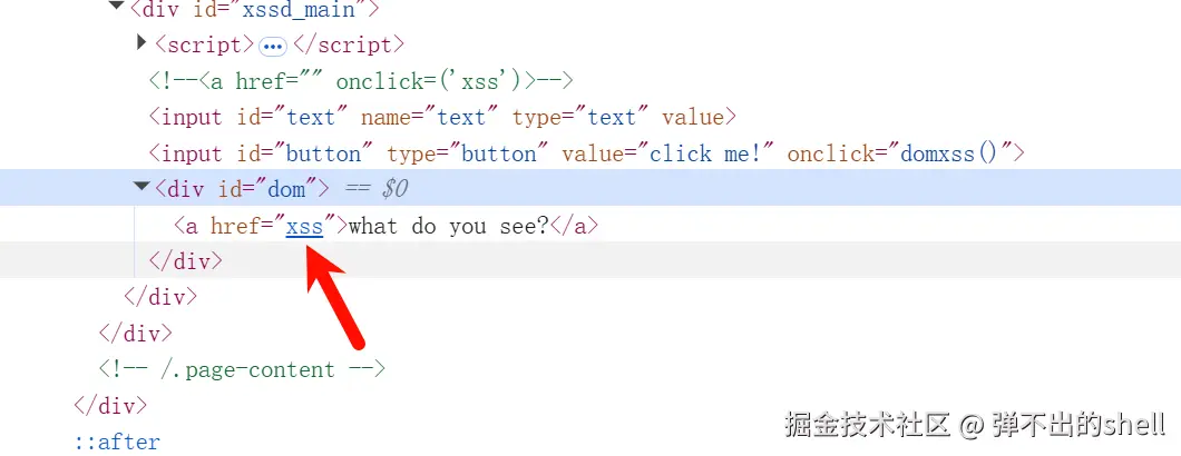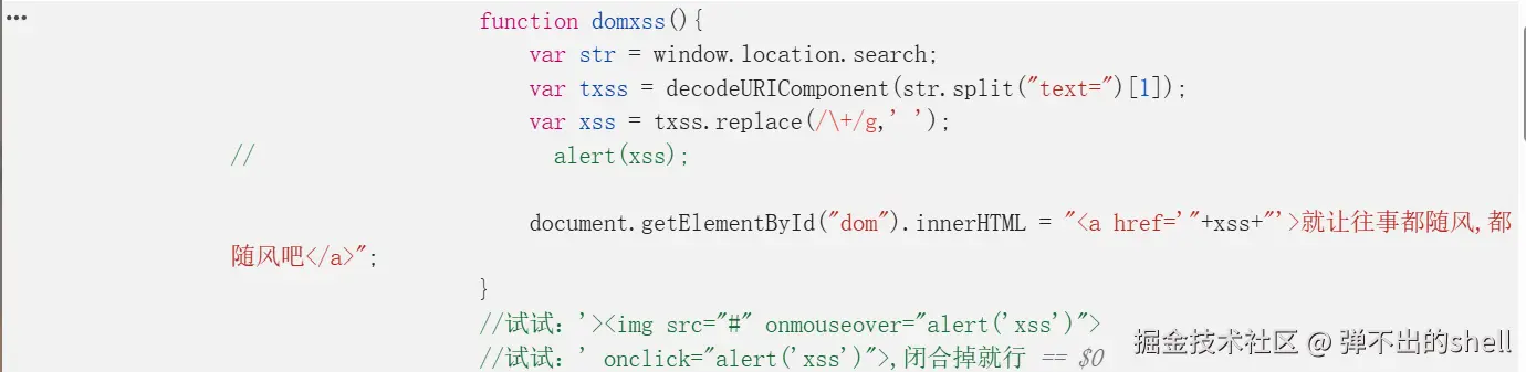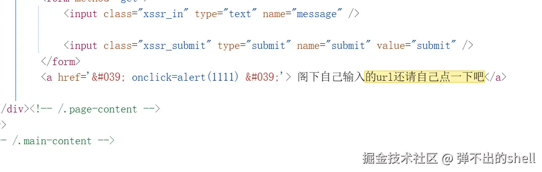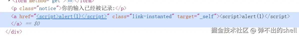 🔍 步骤: 输入代码没有反应,查看源代码发现输入被放入了 <a> 标签的属性中。
