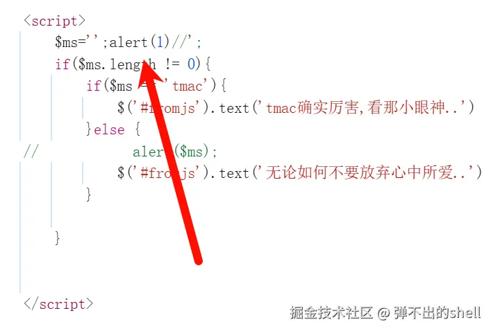 📖 概念: 用户输入被直接拼接到 JS 代码块中,需要闭合 JS 字符串才能注入恶意代码。