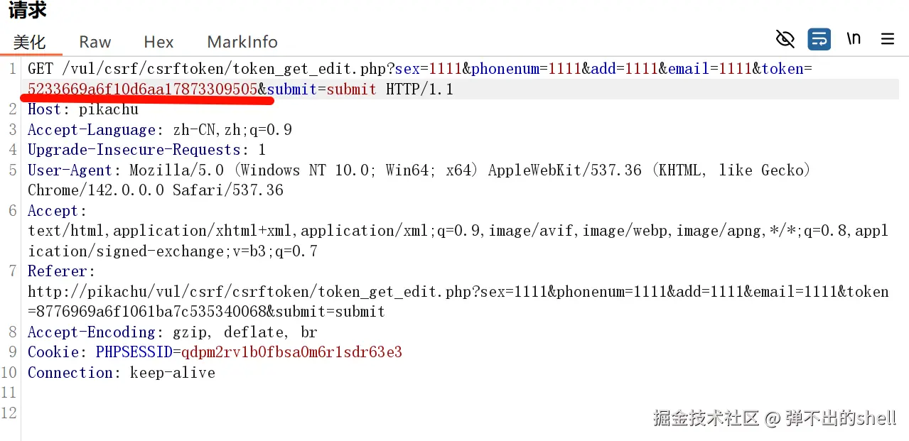 💡 绕过思路: 此处可配合 XSS 漏洞,先通过 XSS 读取页面中的 Token 值,再携带 Token 构造 CSRF 请求,实现完整攻击链: