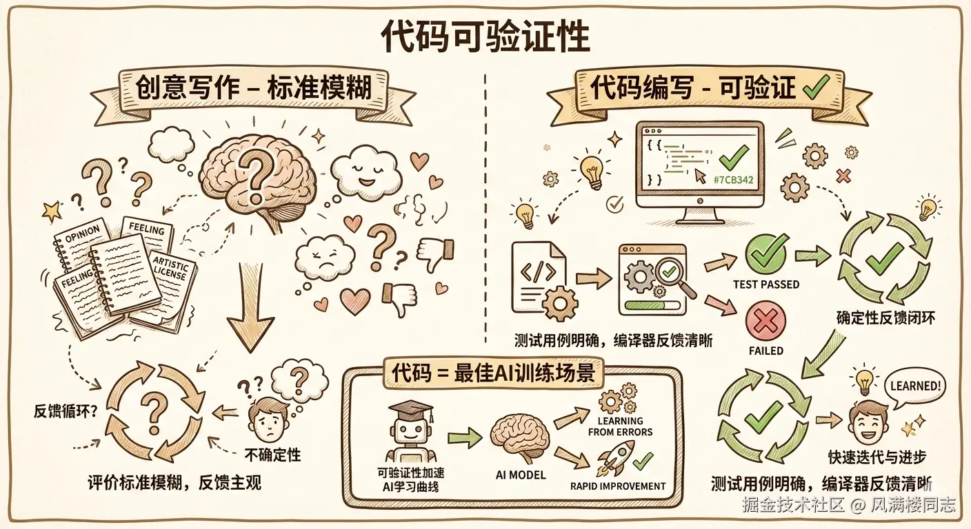 为什么?因为代码是可验证、可闭环的。数学题有标准答案,代码有测试用例,这种确定性反馈,正是训练大模型的沃土。而写文章、画画这些创意工作,评判标准过于主观,AI 很难在其中找到清晰的进化方向。