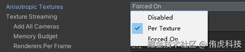 分级设置各向异性过滤:避免全局强制开启。建议在Project Settings中设为"Per Texture",仅对地面、墙面等需要高质量斜视效果的纹理单独开启,并尽量使用较低等级(如2x或4x)。