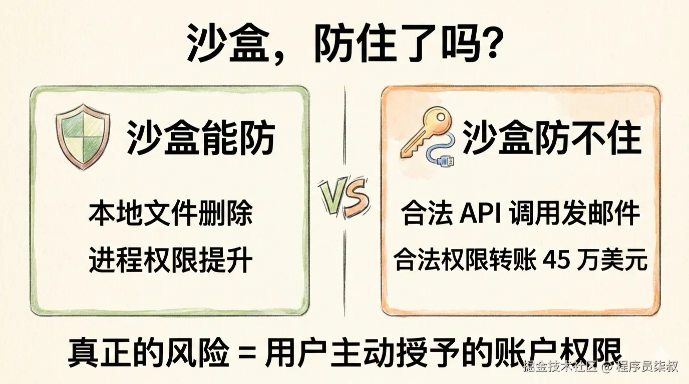 结论 1:沙盒是最低卫生标准,不是安全解决方案。Seatbelt / bubblewrap / landlock 防的是 rm -rf /,防不了合法 API 调用造成的危害。"我们绝对不需要又一个 agent 沙盒产品。"