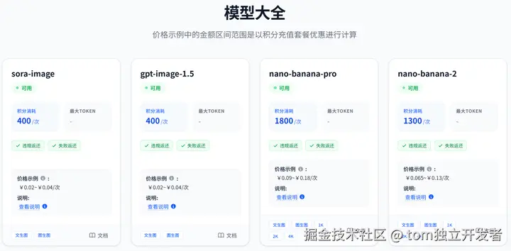 - 更多热门模型:Nano banana pro——0.09/张,Nano banana——0.022/张,Gpt image 1.5——0.02/张,Veo3.1/Veo3.0,Gemini 3.1 pro,Gemini 3.0 pro,Gemini 2.5 pro