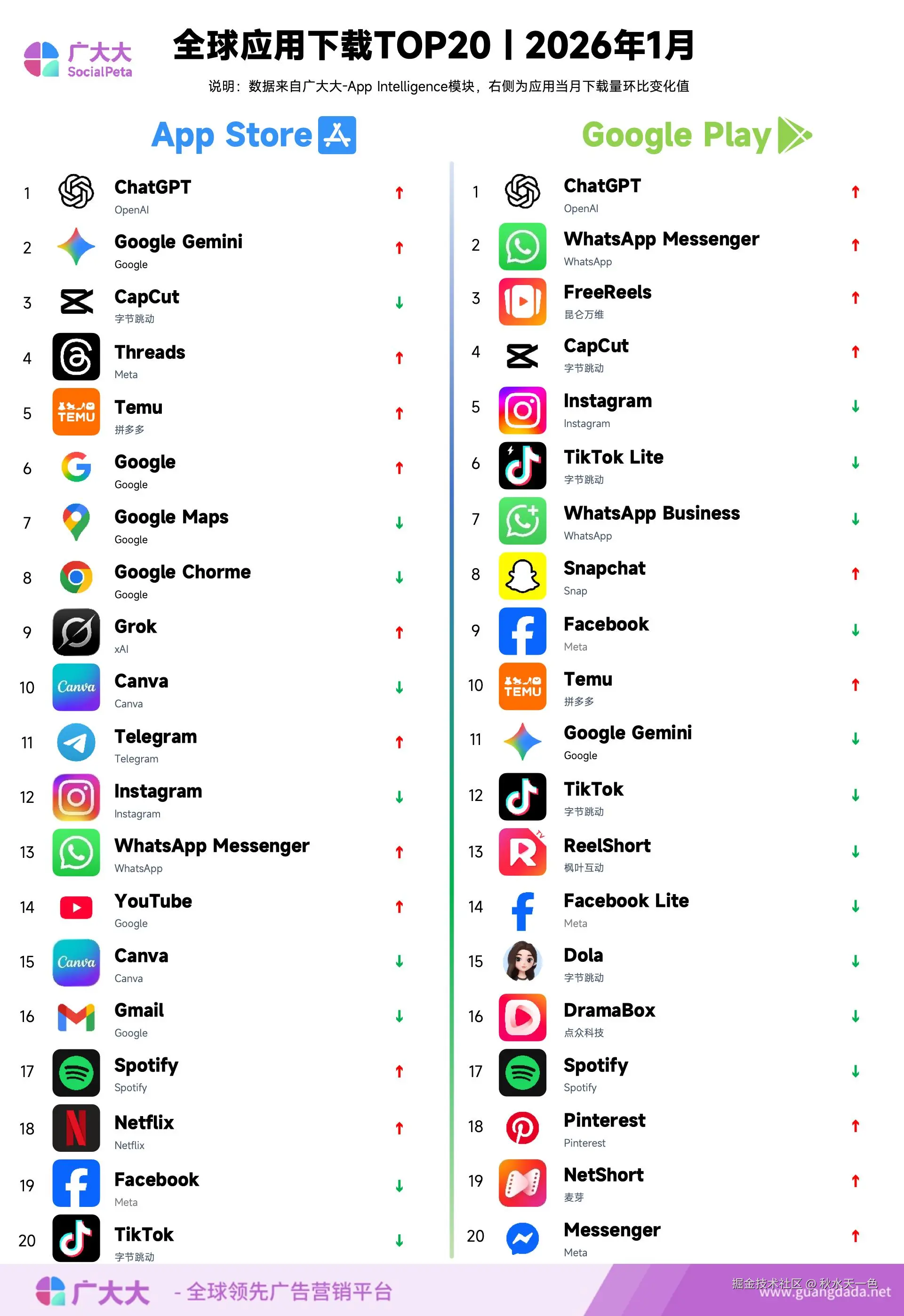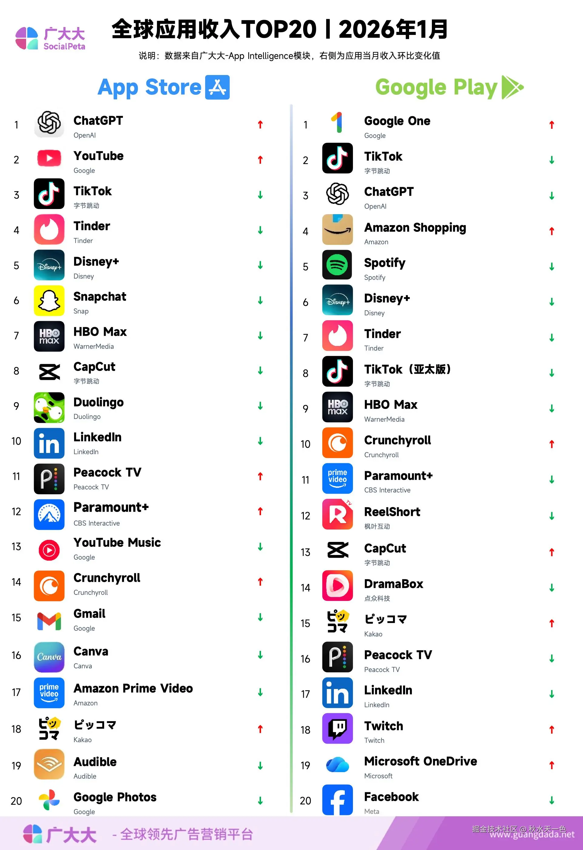 根据广大大 App Intelligence 等模块数据,笔者整理出2026年1月移动应用(非游戏)出海投放、全球收入和下载TOP20榜单,帮助更多移动应用从业人员了解全球移动市场变化趋势。