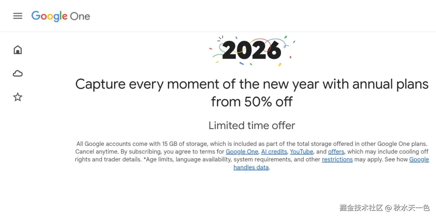 【Google One】在2026年推出了限时折扣,该折扣截至1月15日,新订阅者可享受2TB和AI Pro年费套餐五折优惠,再加上家庭套组还能整合了【Gemini】,最多可6人使用,带动产品订阅提升。