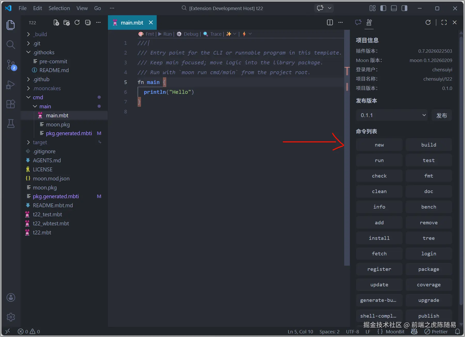 展示了MoonBit官方插件版本,安装的moon构建工具的版本,当前登录的用户,项目的名称,当前项目的版本等一些项目基础信息。