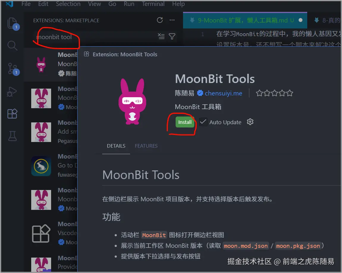 首先要安装这个扩展,搜索moonbit tool即可看到如上图的扩展,点击安装即可。