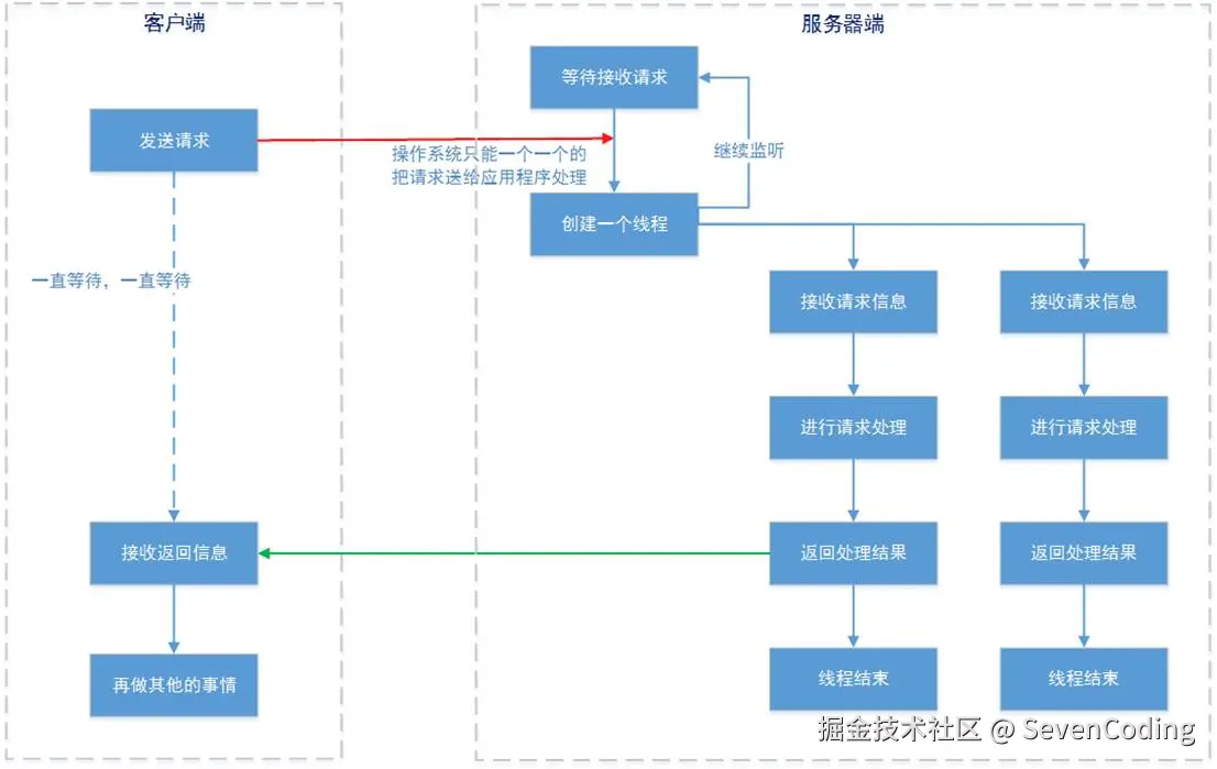当服务器收到客户端X的请求后,(读取到所有请求数据后)将这个请求送入一个独立线程进行处理,然后主线程继续接受客户端Y的请求。
