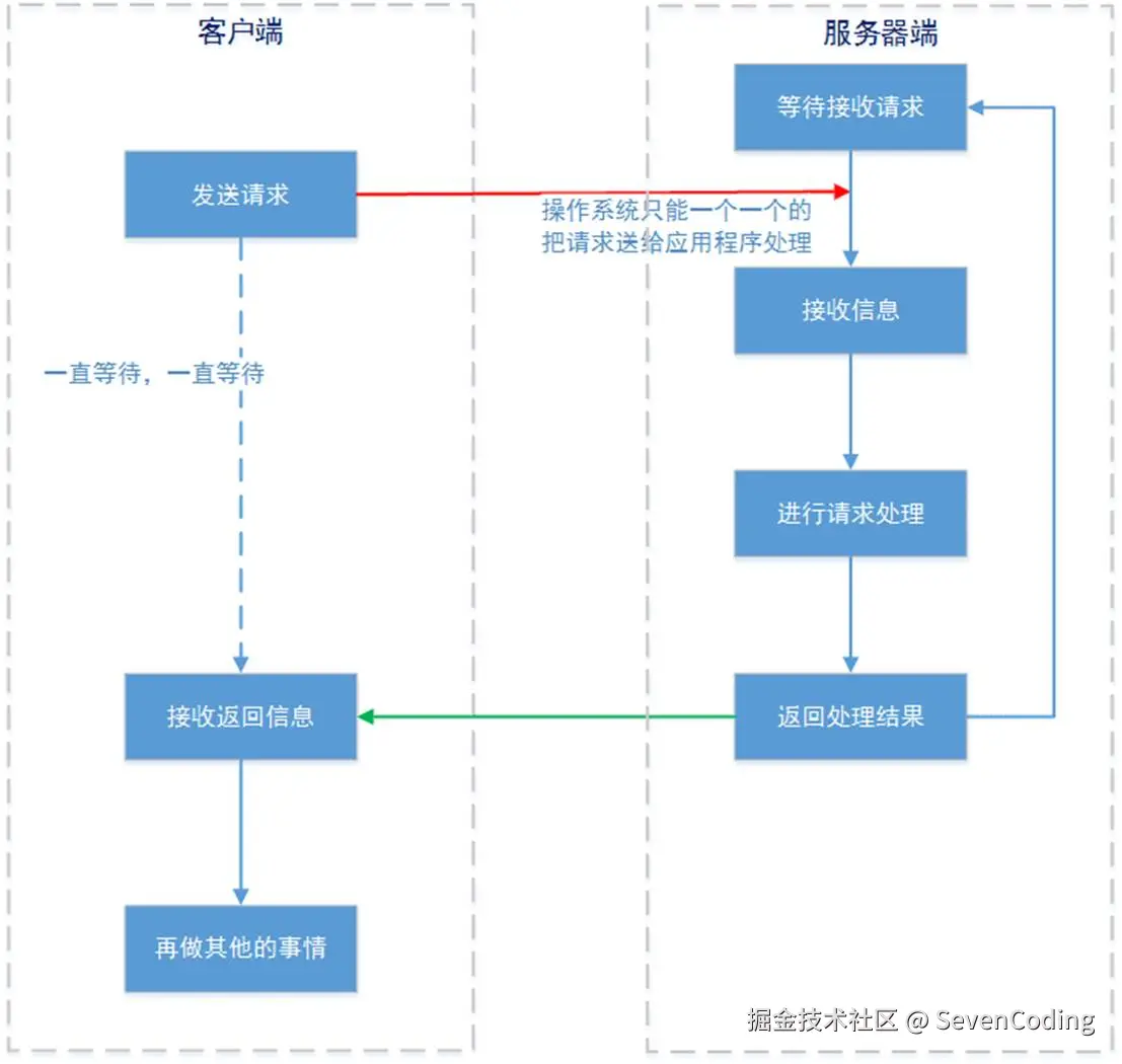 由于服务器一次只能处理一个客户端请求,当处理完成并返回后(或者异常时),才能进行第二次请求的处理。很显然,这样的处理方式在高并发的情况下,是不能采用的。