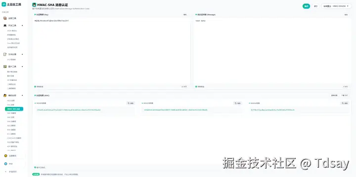在实际开发过程中,使用一个在线工具来计算 HMAC 值,可以帮助快速验证算法结果,也能减少重复写测试代码的时间。