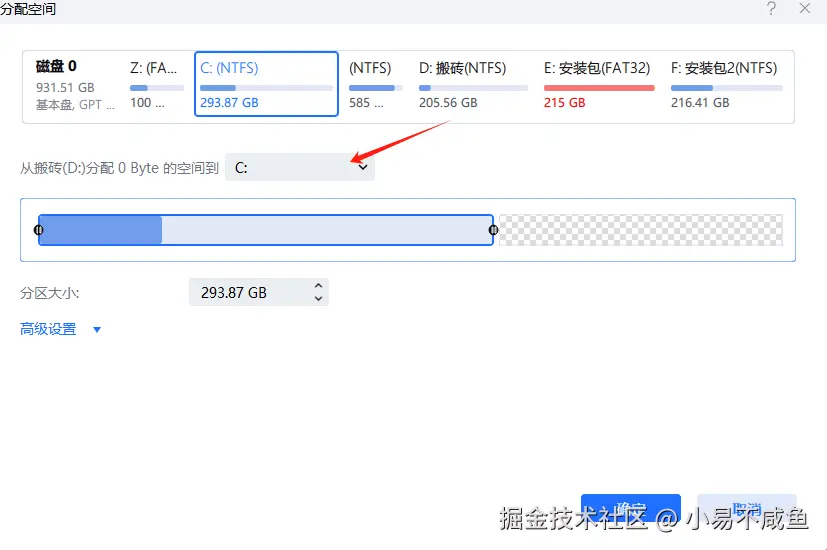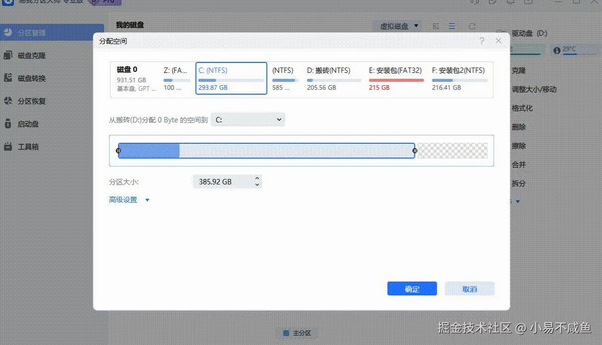 若 C 盘与 D 盘之间有其他分区(如 E 盘),或想更灵活调整空间,易我分区大师是最优选择 —— 它能跳过 “空间必须相邻” 的限制,直接将 D 盘、E 盘的空间转移到 C 盘,且支持无损操作。