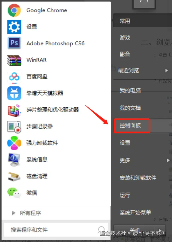 1.点击【开始】菜单栏中的【控制面板】