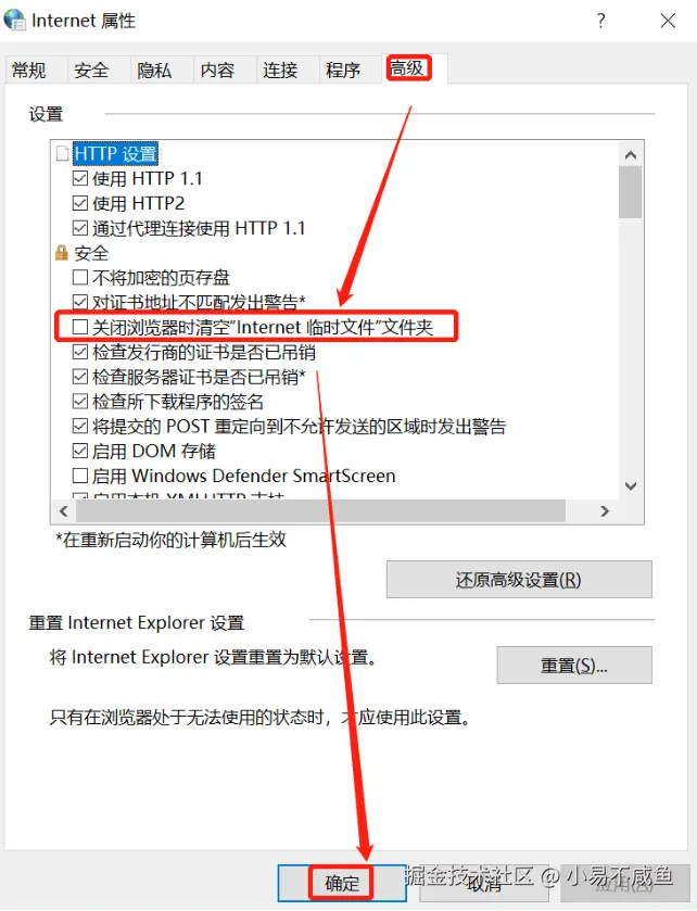 3.在弹出的 Internet 选项属性页面中,点击【高级】选项卡,勾选【关闭浏览器时清空 Internet 临时文件夹】并点击确定