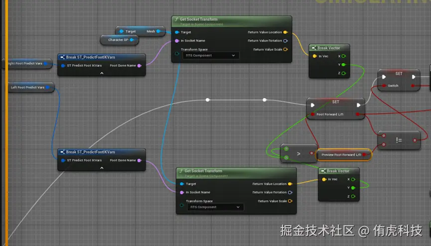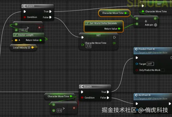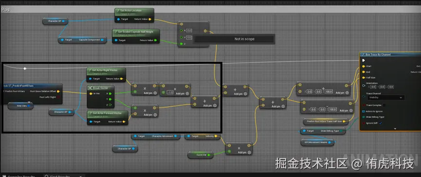 在PreDictFootLocation中,思路是通过我们之前生成的脚步落地曲线以及角色的移动速度来获取落点(除去黑框的内容)。