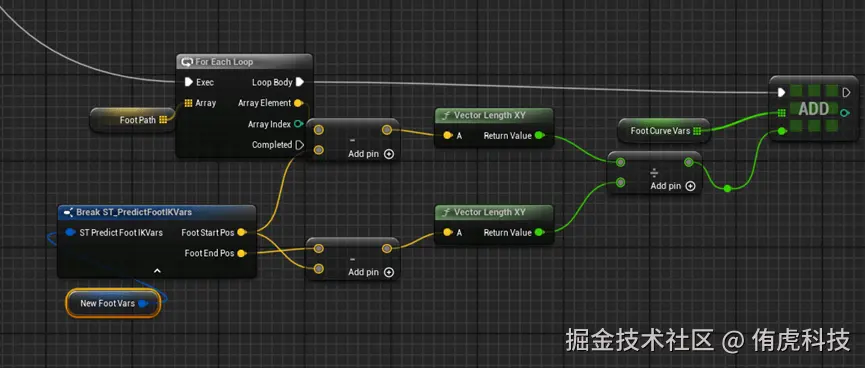 通过记录每个点到开始点的距离比例,记录下来,这样开始点是0,结束点是1,中间点介于0-1,最后就得到了FootPath记录点位世界坐标的数组和一个Foot Curve Vars的数组。