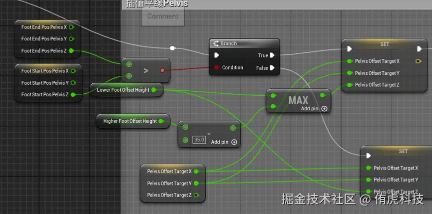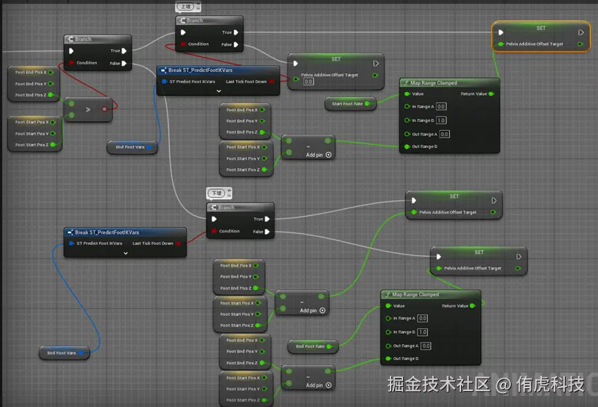 注意结束点要在脚落地时一直更新,因为我们之前提到了会有误差,那个落点会一点点向角色靠近,如果只取那一帧的会对不上,所以在脚落地时Pelvis的落点也要一直更新。