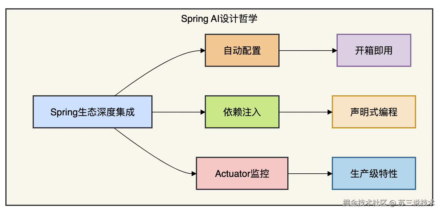 Spring AI与Spring Boot、Spring Cloud无缝集成,提供自动配置、Actuator监控、依赖注入等特性。