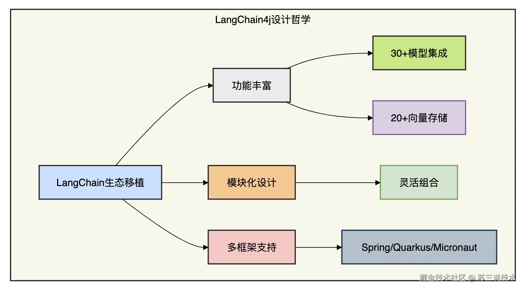 LangChain4j则是LangChain在Java生态中的官方实现,始于2023年初,旨在填补Java生态缺乏与Python、JavaScript同等水平LLM库的空白。