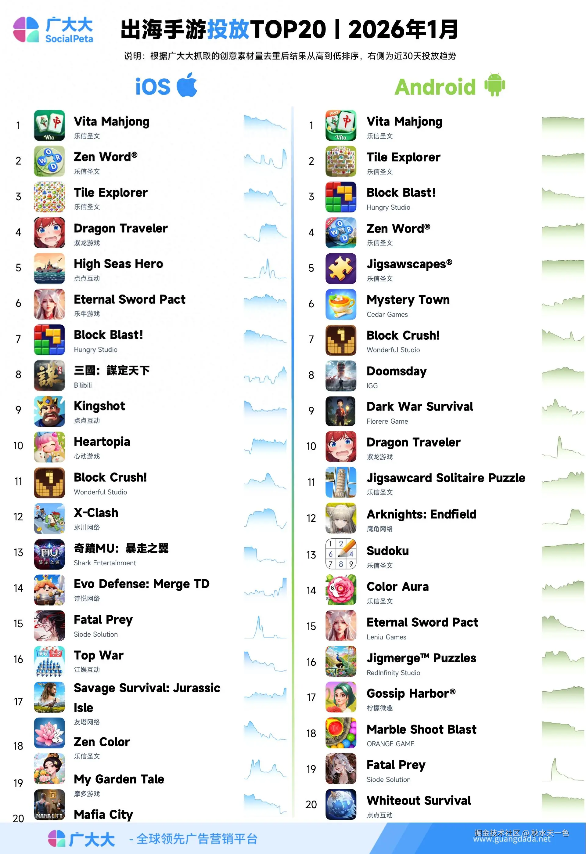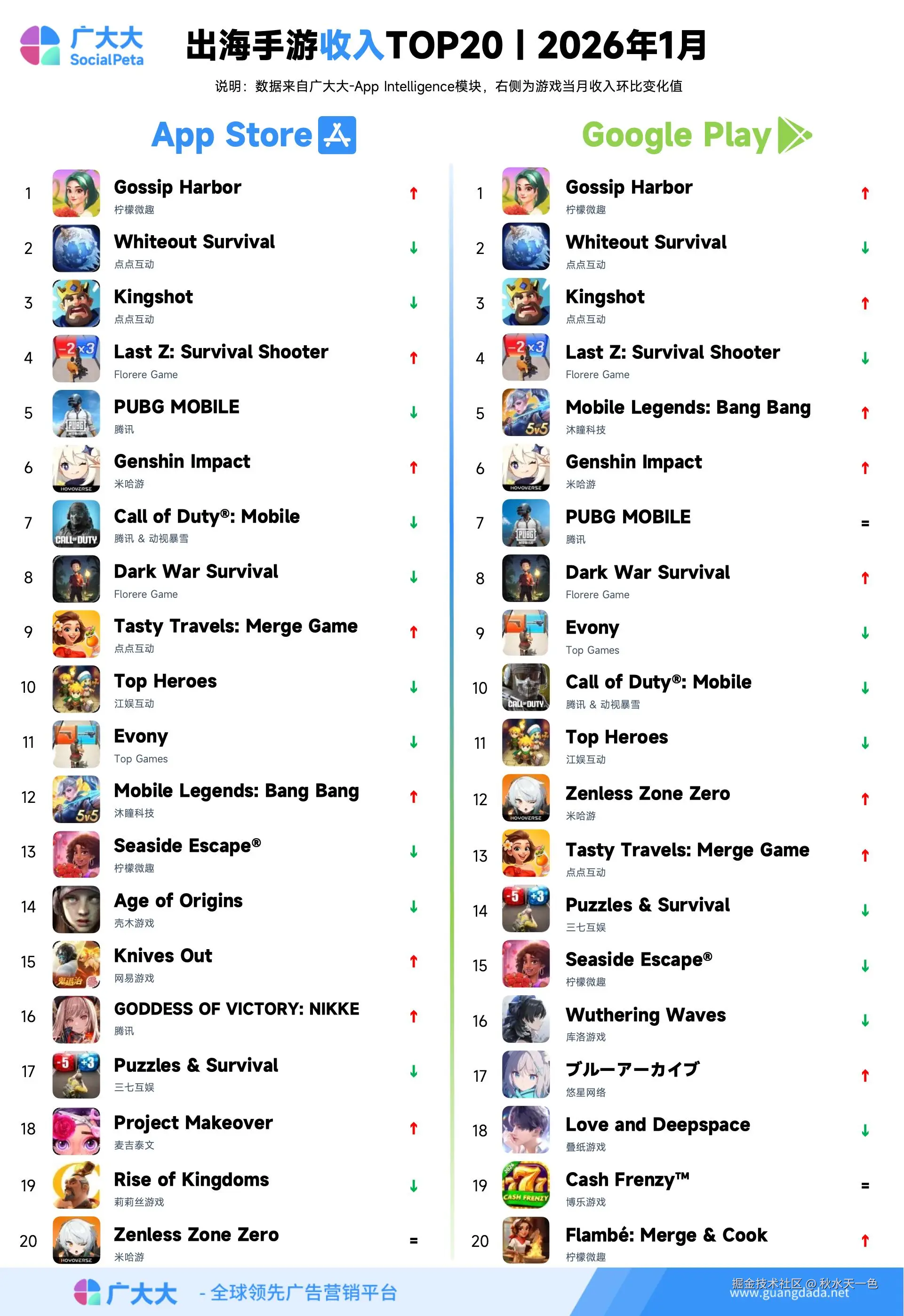 根据广大大——App Intelligence等模块数据,我们整理出2026年1月出海手游投放、收入和下载TOP20榜单,帮助更多出海手游从业人员了解全球移动市场变化趋势。