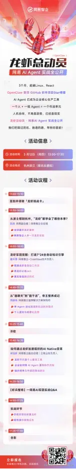 “你养龙虾了吗?”成为AI圈的新问候语。3月12日,网易智企将在杭州组织一场“龙虾总动员”活动,全方位公开网易的“养龙虾心得和成果”,具体议程见下方海报。