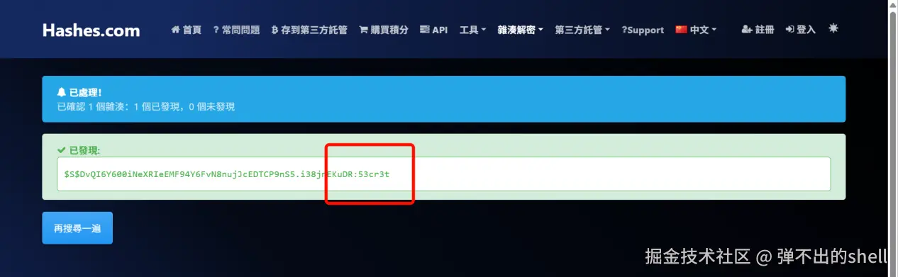 密码为 Drupal 使用的 PHPass 加密格式($S$ 开头),使用在线工具破解: