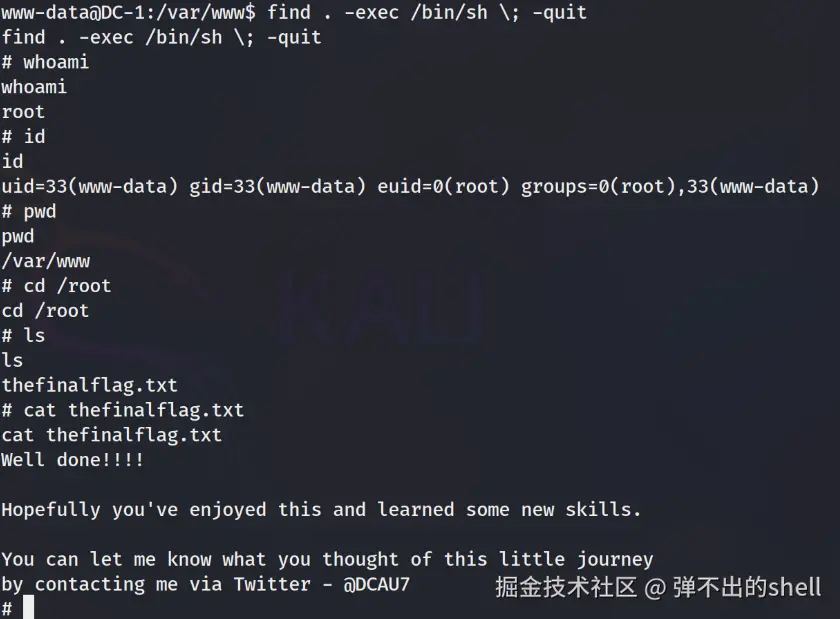 💡 登录 flag4 后同样可以利用 SUID find 或内核漏洞提权至 root。
