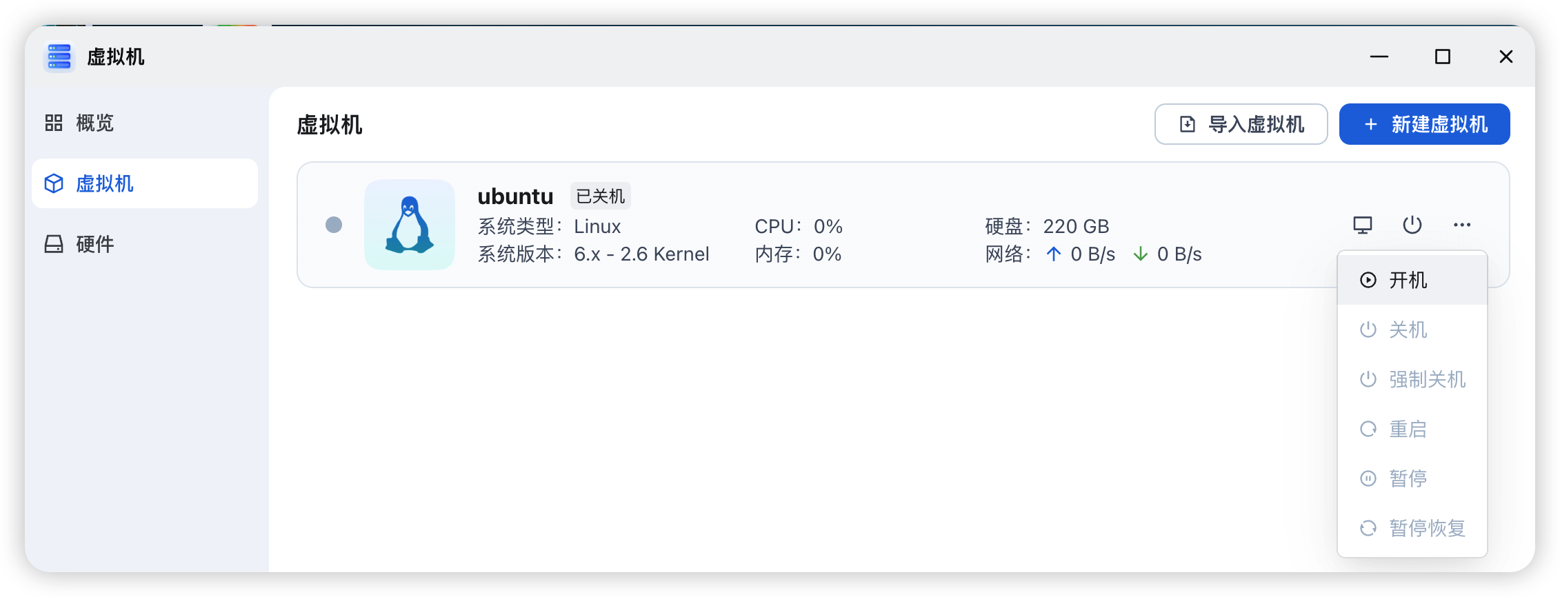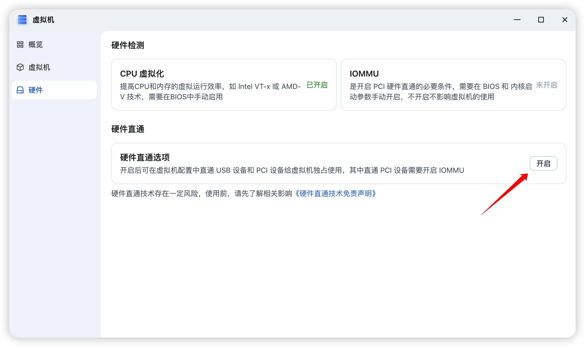 安装后打开「虚拟机」,如果需要使用硬件直通功能,可以在硬件面板里提前开启。