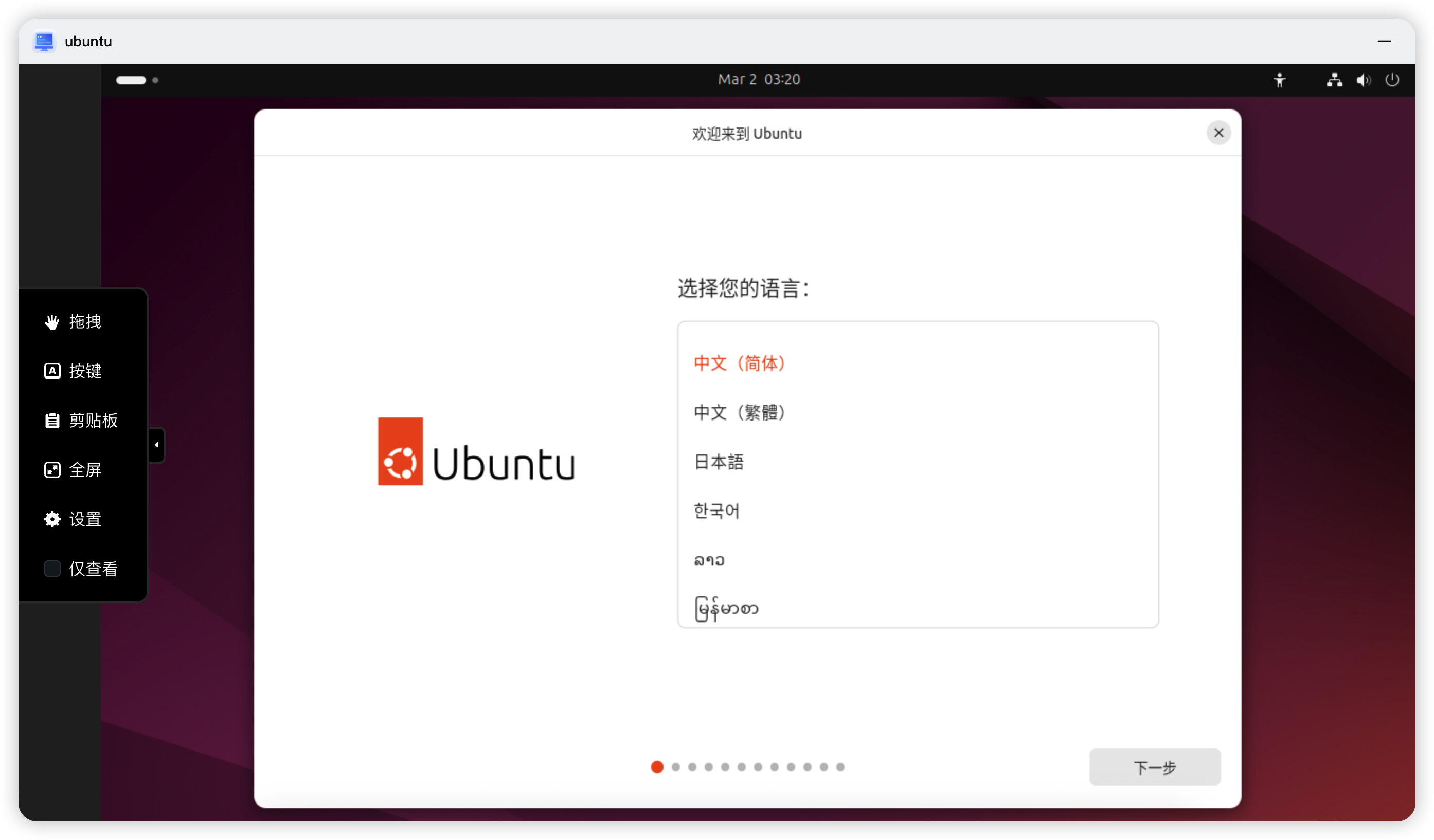 之后进入系统初始化向导,按提示设置语言、账号、密码即可。