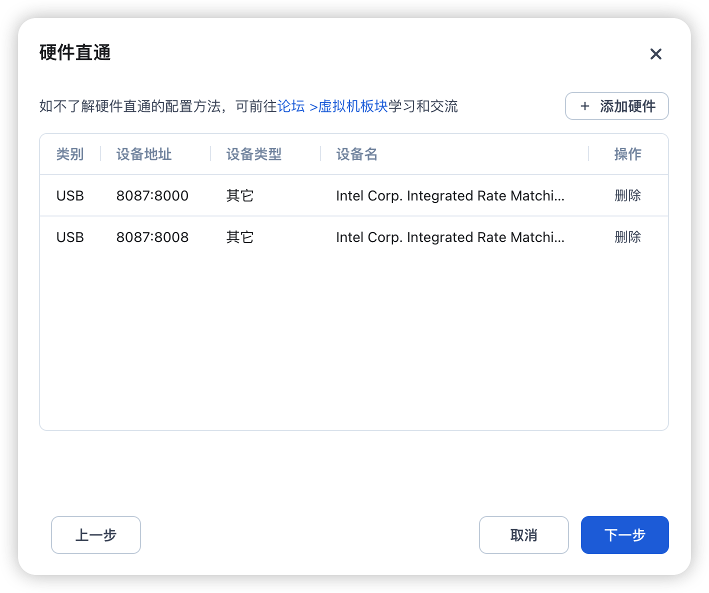 之后可以配置硬件直通,比如需要用到 USB 设备就设置,不需要直接跳过。