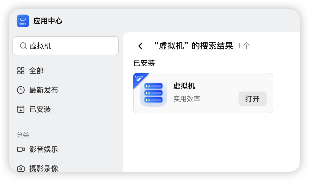 打开飞牛 NAS 的「应用中心」,找到虚拟机应用并安装。