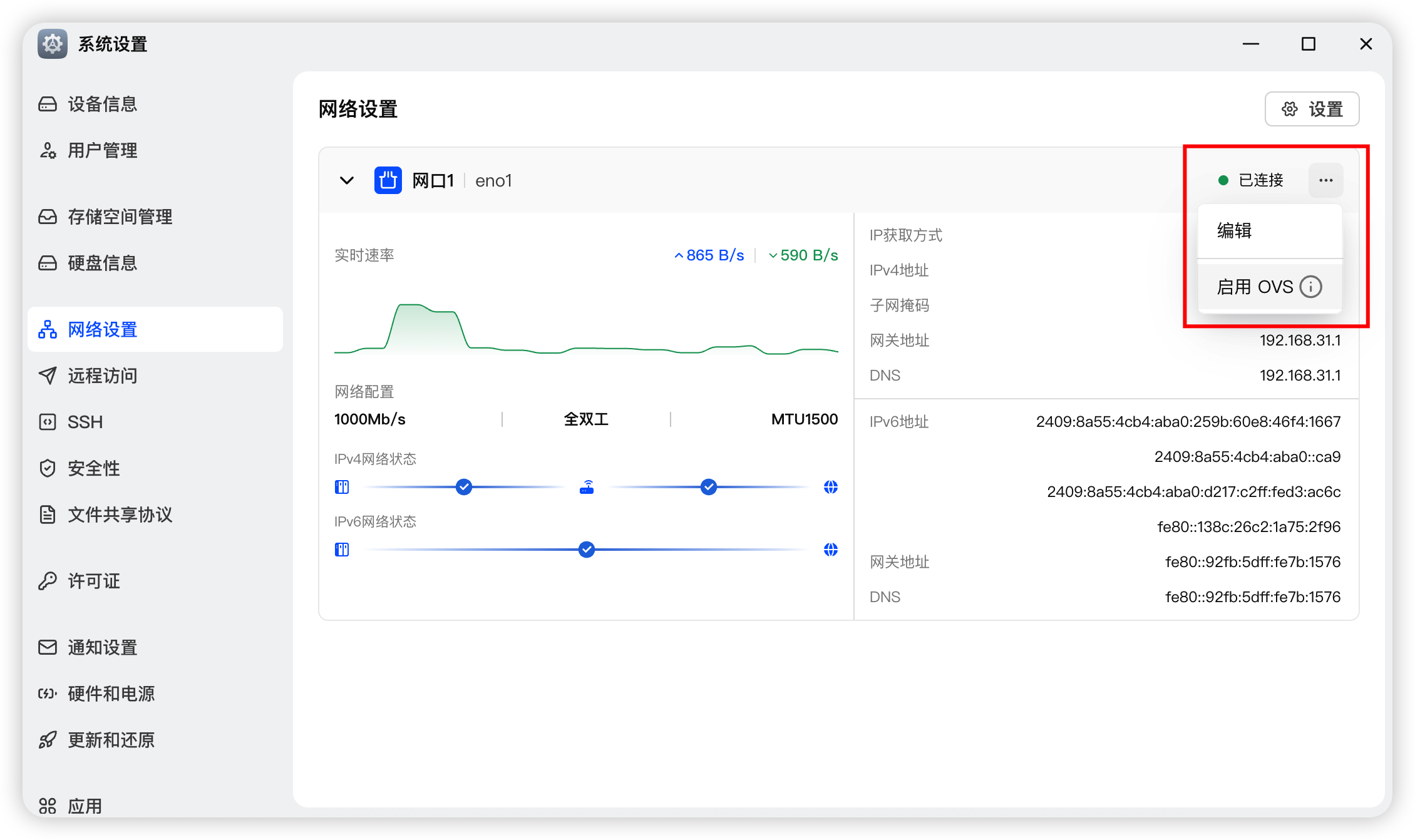 如果你这里没有网卡可选,去 系统设置 – 网络设置 开启 OVS 即可。