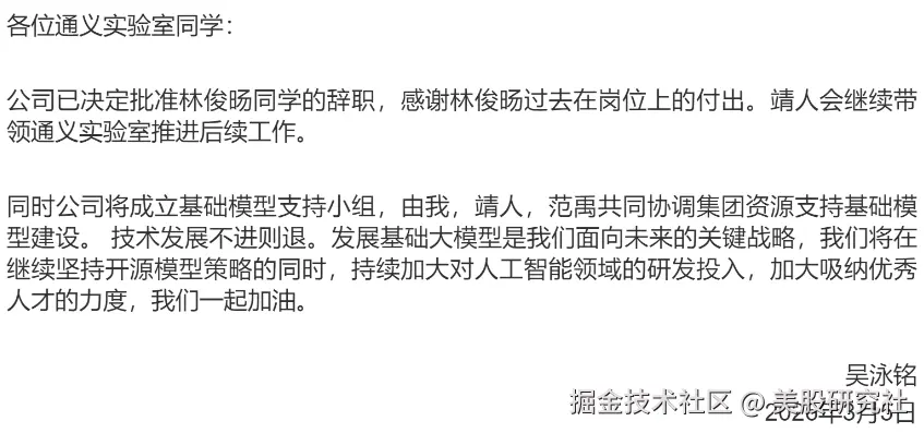 林俊旸辞职,是个人权责预期与组织发展需要之间产生落差,无关恩怨,无关路线。而阿里千问的核心目的,是为了容纳更多大牛加入战车,打造更强劲的底盘。