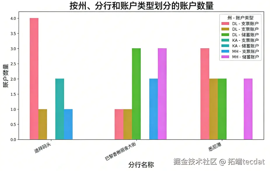 可视化代理生成了分组条形图,展示了各省份、支行、账户类型的账户数量分布。