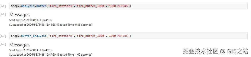 新建单元格输入以下代码,其中fire_stations为输入要素类,fire_buffer_1000为输出要素类,1000 METERS为缓冲距离。