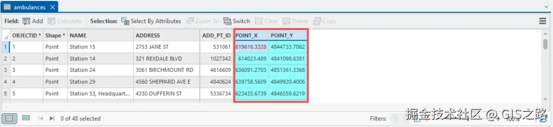 ambulances要素类上右键,点击属性表,显示结果如下。