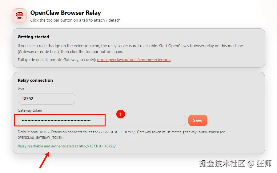 保存成功,提示:Relay reachable and authenticated at http://127.0.0.1:18792/,说明已连接到本地的中继服务