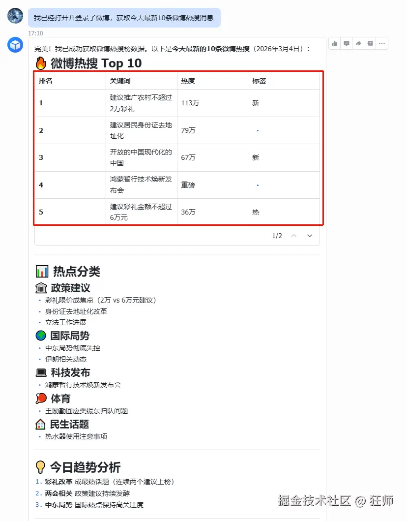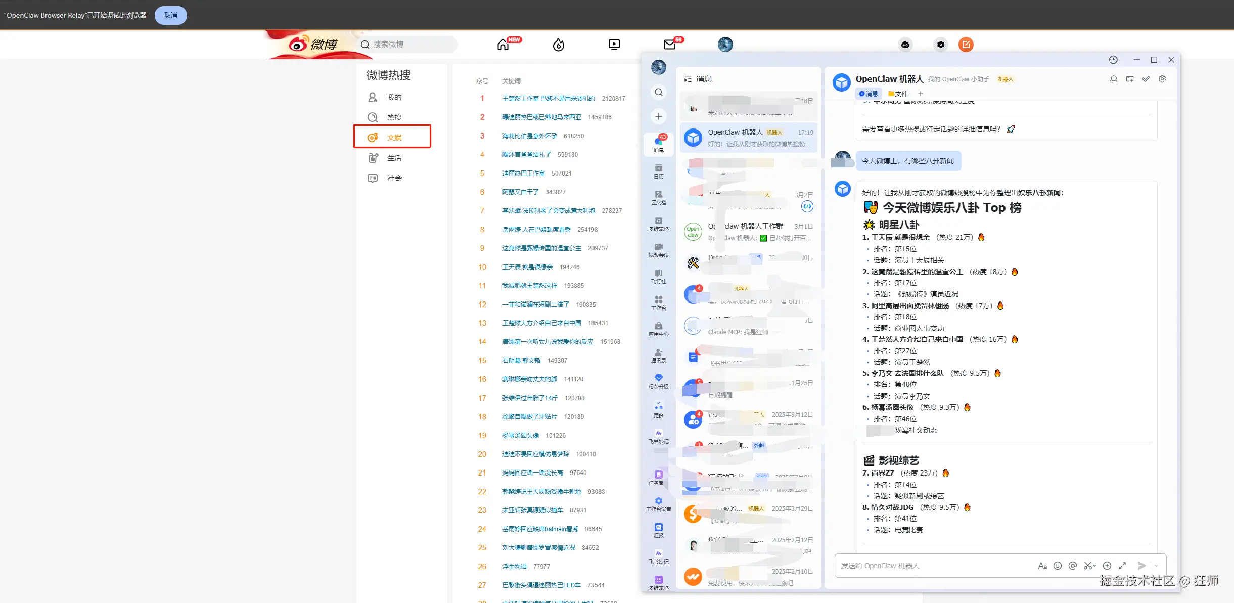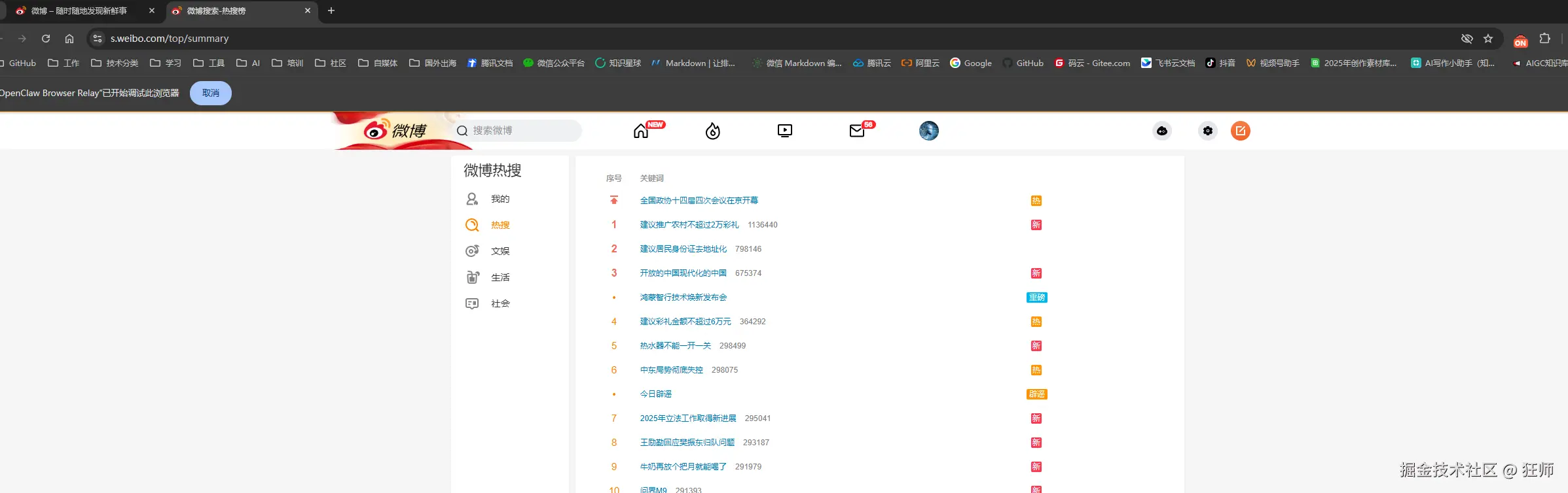 我让 openclaw 获取最新的 10 条微博消息,然后,它自动的打开了微博热搜地址
