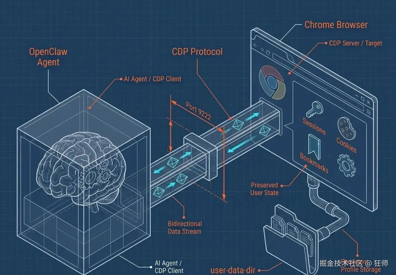 Chrome 内置了一个叫 DevTools Protocol(CDP)的调试接口。平时你按 F12 打开的开发者工具,底层用的就是这个协议。我们要做的,就是让 Chrome 把这个接口通过一个本地端口暴露出来,然后让 OpenClaw 连上去。