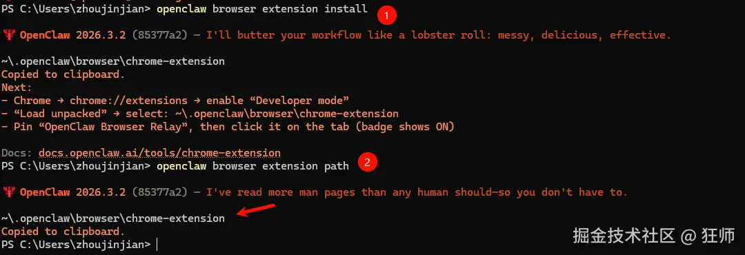 整个操作过程还是非常简单的,总共分两步,第一步安装OpenClaw的插件,第二步安装谷歌浏览器的拓展程序。